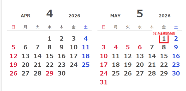 カレンダー上ではこうなっています。赤の四角が5月1日「さいたま市民の日」です。